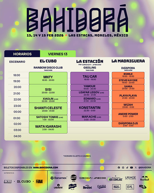 Como cada año, se hará un takeover donde han participado sellos y clubs míticos como Fania, Tresor o Giegling. Este año los invitados serán el festival hermano japonés Rainbow Disco Club, quienes al igual que Bahidorá 2026 tiene un lugar mágico como residencia: las montañas de Izu, a las afueras de Tokio. En su lineup encontramos lo más fino y bailable de la isla del Pacífico: el pionero del House Satoshi Tomiie, el Tecno hipnótico de Wata Igarashi, Shanti Celeste quien une virtuosamente el House y Garage, Xiaolin que une los sonidos legendarios japoneses a terrenos electrónicos, así como el DJ residente Sisi. Toda esta interesante mezcla oriental se presentará como siempre el viernes, justo para arrancar como se debe un gran fin de semana.